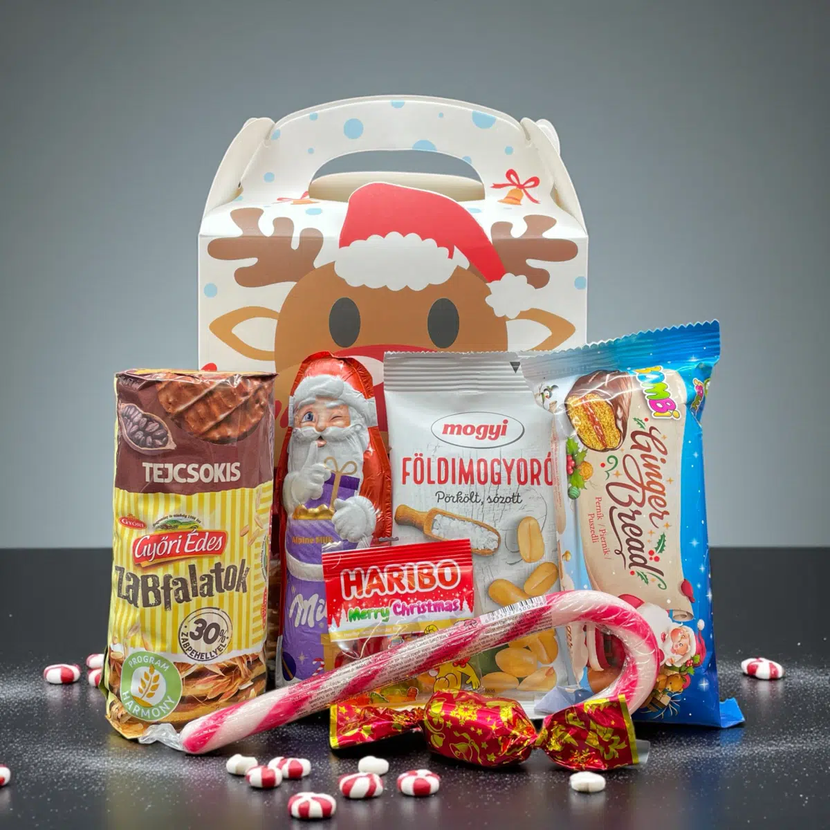 Mikulás doboz szarvasos mintával (16x17x9,5 cm): 1db